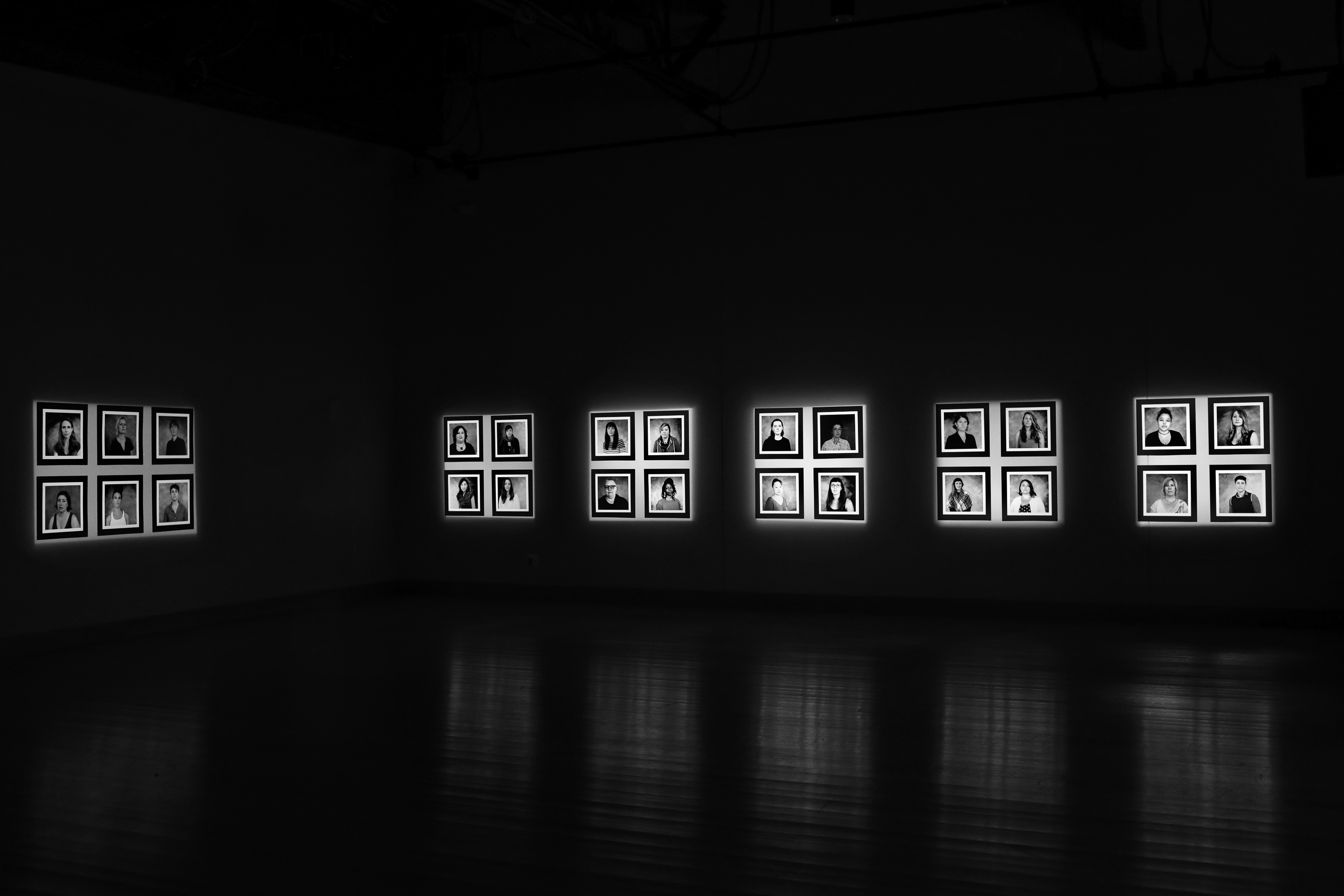 The room was dark and the portraits were glowing. Layers of audio filled the space, an animated transcript of the dialog was projected on the wall.
